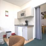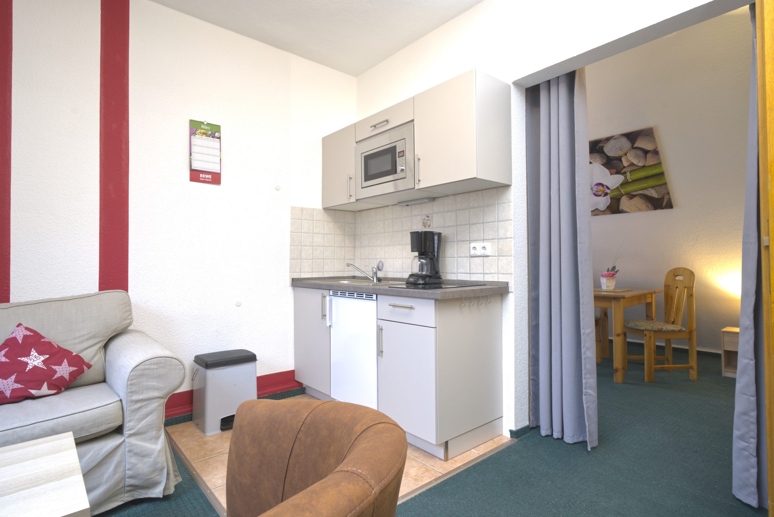 - Küche mit Herd, Kühlschrank, Kaffeemaschine, Wasserkocher, Toaster
