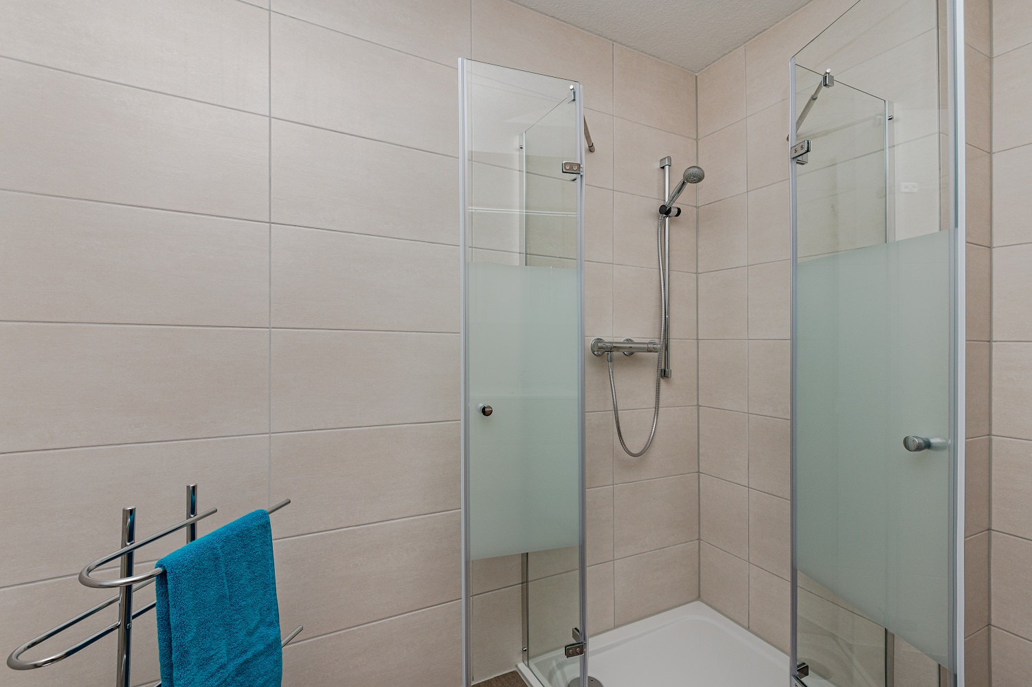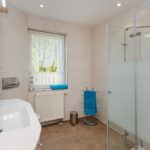 - 1 modernes Bad mit Dusche, Waschtisch und WC
