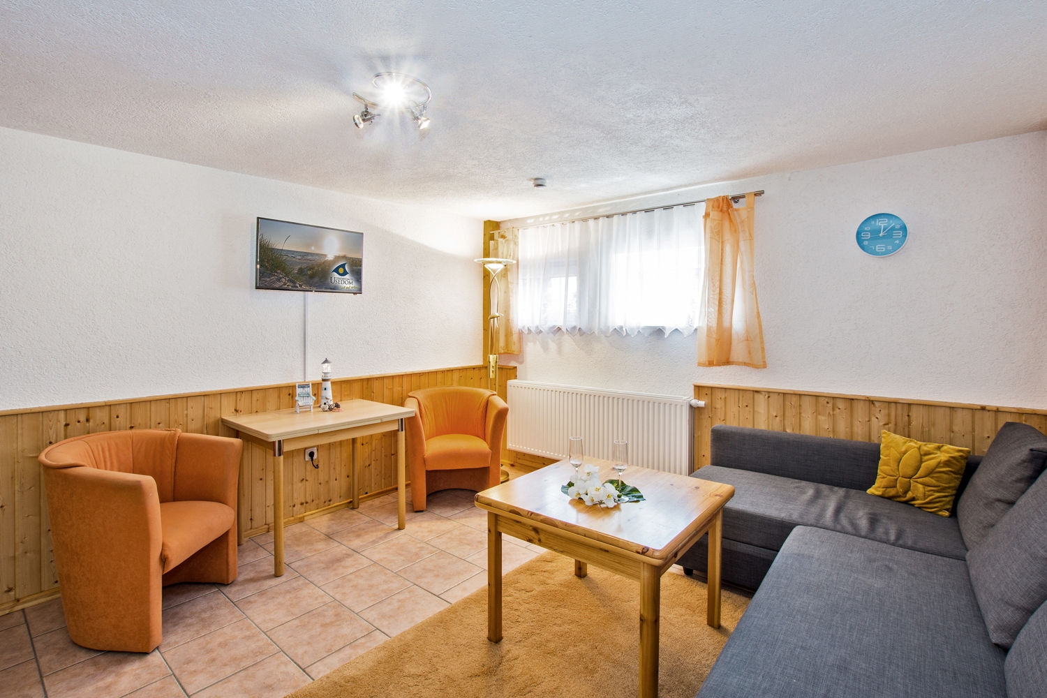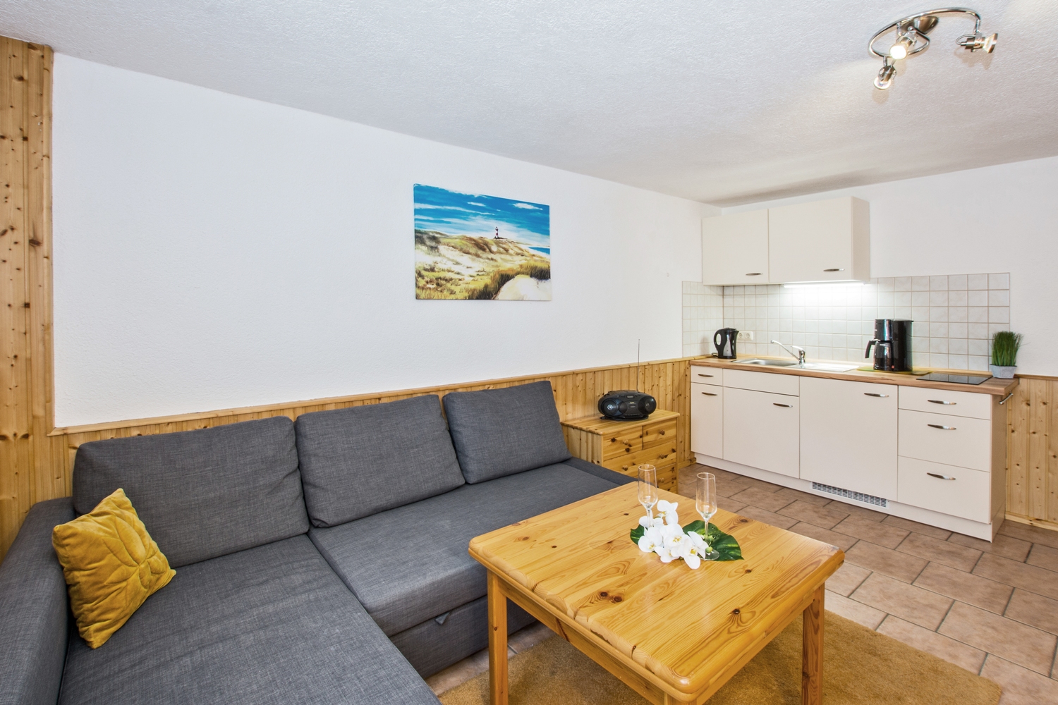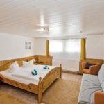 Die modern eingerichtete Ferienwohnung 4, mit einer Größe von ca. 60 qm, befindet sich im Souterrain. Der Wohnraum, in welchem eine offene Pantry-Küche integriert ist, verfügt über eine gemütliche Schlafcouch sowie einen Fernseher. Die Schlafcouch bietet Platz für zwei mögliche Aufbettungen. Das Schlafzimmer ist mit einem bequemen Doppelbett, einer weiteren Schlafcouch (dritte mögliche Aufbettung), Stauraum für Ihre persönlichen Sachen, sowie einem weiteren Fernseher ausgestattet. Ein Komfortbad mit Eckbadewanne, separater Dusche und WC machen die Wohnung komplett. Wer mit einer größeren Familie oder Freunden anreisen möchte, hat die Möglichkeit, die im Erdgeschoss gelegene Wohnung 3 mit hinzu zu buchen. Über eine innere Verbindungstür lassen sich beide Wohnungen verbinden.